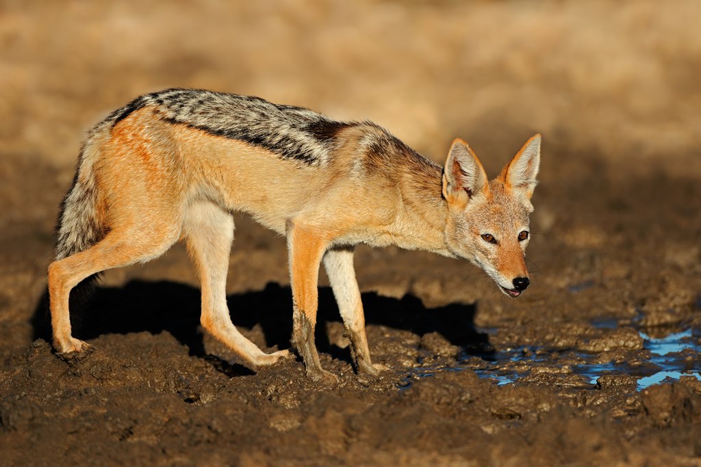 The Black-backed Jackal has a distinctive black and white saddle that is wide at the neck and shoulders and narrows toward the tail. It is a medium-sized, canine-like carnivore. The jackal is a nocturnal animal that lives mostly in Southern Africa. They are incredibly crafty and resourceful animals that eat fruits, berries, small mammals, and rodents. They eat young and small antelope as well.